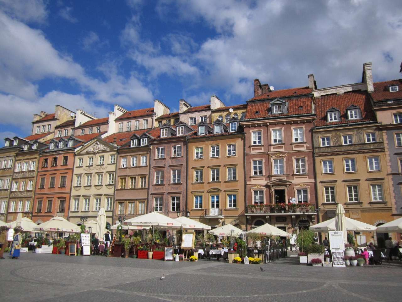 바르샤바 여행의 중심이라는 '올드타운'. 그냥 봐도 예쁜 집 와 노천카페가 곳곳에 널려 있다. 제2차 세계대전 때 바르샤바는 도시의 85%가 모두 폐허가 되었다고 했다. 그래서 말이 올드타운이지, 예전의 모습 그대로 복구해 놓은 뉴타운이다. 새 건물만 많아 볼 게 없다는 바르샤바지만 이런 역사를 알고 보면 꼭 비난할 수만은 없는 것 같다. 특히 올드타운을 예전 모습 그대로 복구하는 건 참 아름다운 일이다.