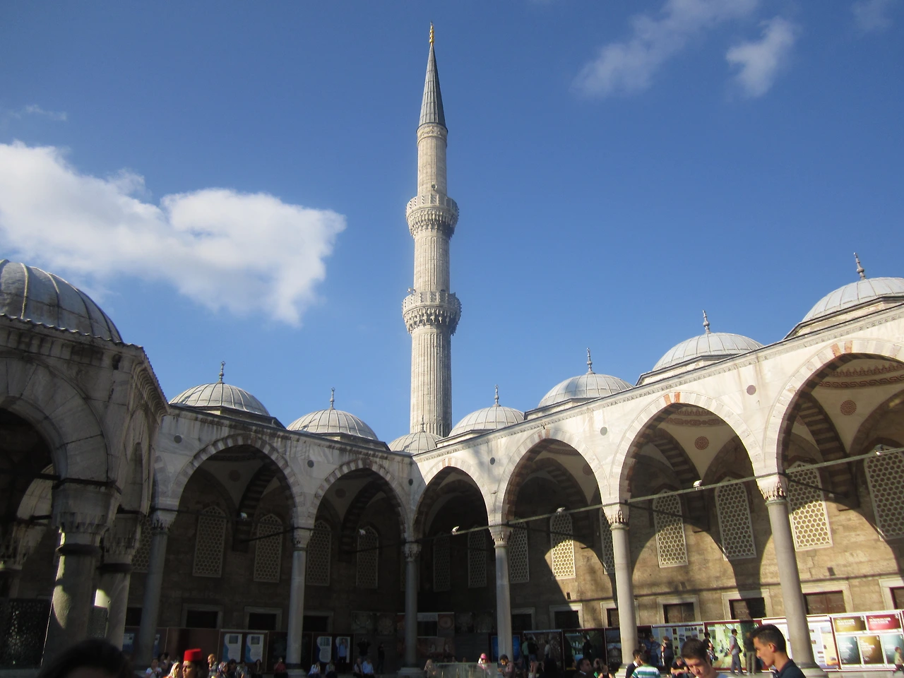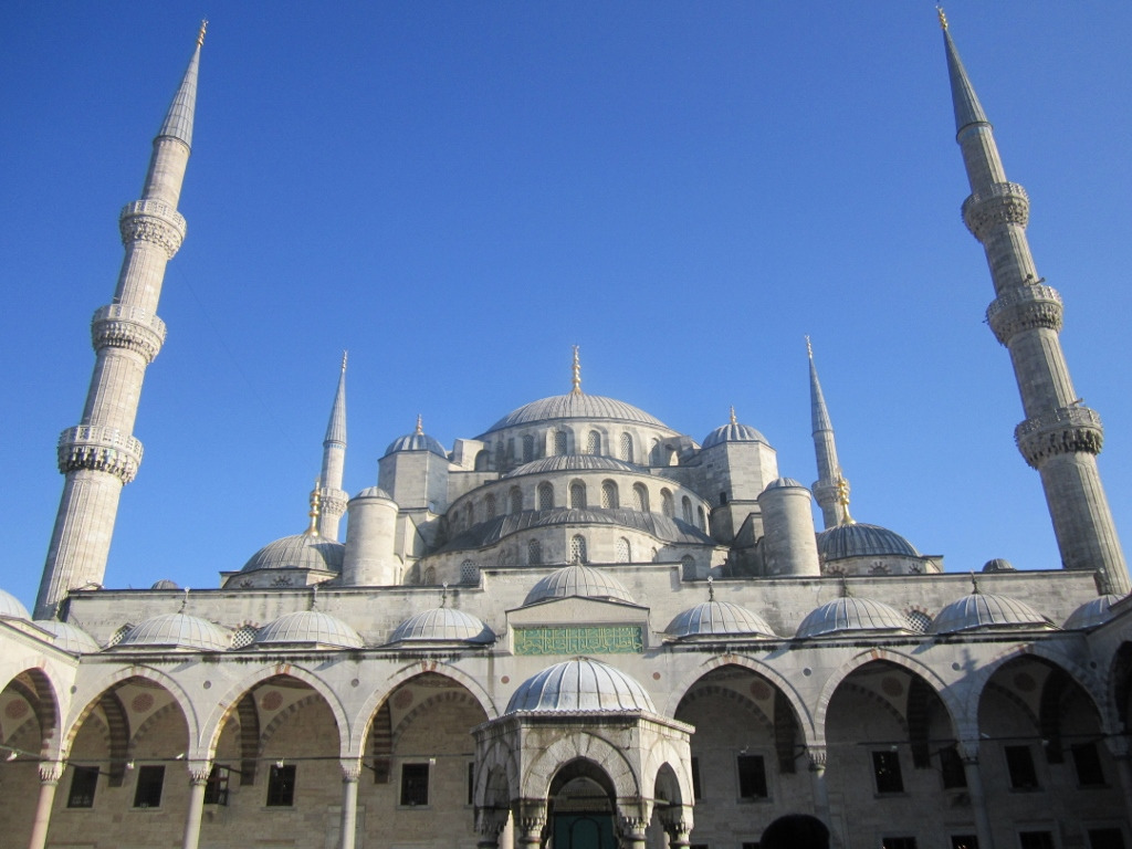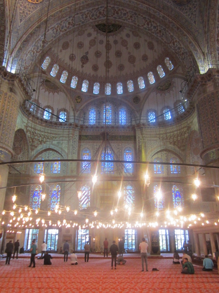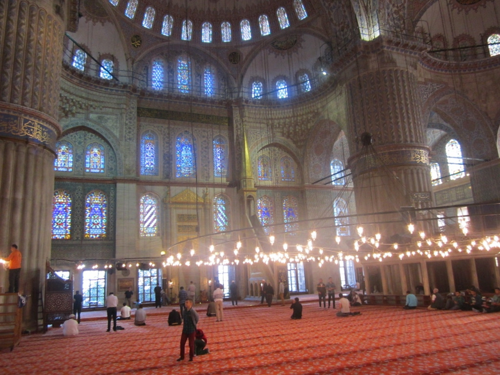 천장을 수놓은 화려한 색의 배열. 양탄자가 모스크 내부를 다 둘러버린 것 같다. 긴 줄을 기다려 들어온 블루모스크는 과연 나를 실망시키지 않았다. 이 지역 특유의 분위기를 물씬 풍기는 천장과 벽의 그림. 고개를 바짝 들어야 할 만큼 높다란 천장. 과연 술탄이 이곳에서 예배드렸다는 명성답게 어마어마한 규모를 자랑하고 있었다. 그때까지 내가 본 모스크는 싱가포르에서 본 술탄 모스크가 전부였고, 그것도 충분히 아름다웠다. 하지만 이스탄불에 있는 건 정말 차원이 달랐다. 이렇게 거대한 모스크에 얼마나 많은 사람들이 빽빽하게 들어앉아 기도하고 예배드릴까. 기둥 중간마다 적혀 있는 아랍어는 이곳에 신비로움을 더했다. 스태인드 글라스를 통해 들어오는 빛과 정중앙에서 빛을 내고 있는 거대한 샹들리에가 정말 아름답다. 천장의 둥근 돔과 정교하고 아름다운 벽 덕택에 바닥에 양탄자가 아닌 교회 의자를 갖다 놓아도 잘 어울릴 것 같다. 모스크든 교회든 이곳의 분위기와 잘 어울리는 것을 보면 종교적인 분위기로 이곳을 잘 꾸며놓았구나 싶다. 모스크 구석구석마다 기도하고 있는 사람들이 있어 카메라를 들이댈 때마다 조금 조심스러웠다. 누군가에게는 성스러운 장소인데 구경거리로 보는 나 때문에 그들의 종교활동에 방해가 되는 건 아닐까.. 괜한 노파심을 가지며 모스크를 나왔다.