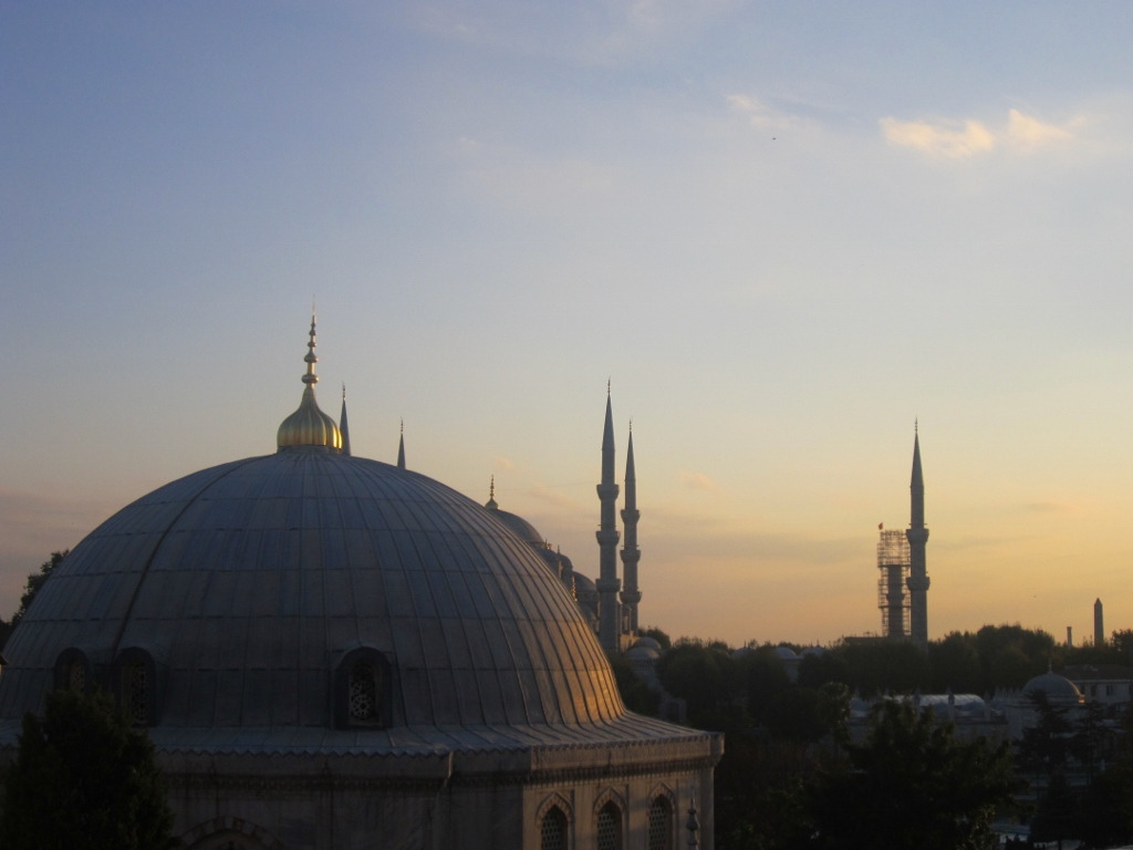 아야 소피아 성당의 2층 스테인드 글라스 틈으로 지는 석양이 보인다. 해가 지는 하늘로 보이는 모스크의 돔이 참으로 아름답다.
