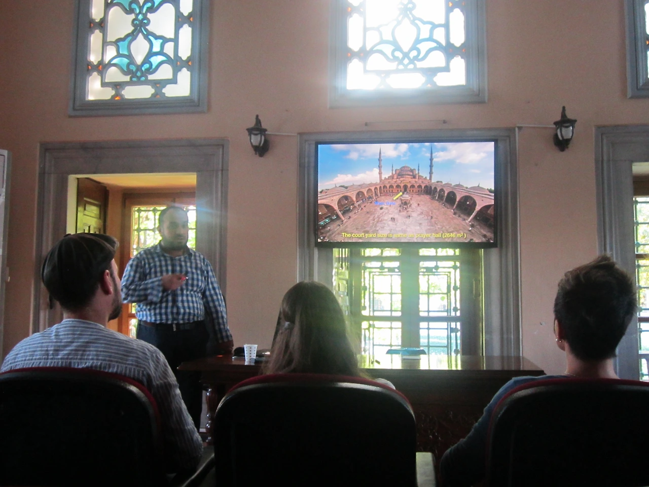 거대한 블루모스크 앞에 도착했다. 파란 하늘과 너무나도 잘 어울린다. 둥근 돔 여러 개가 모스크의 천장을 이루고 있는 게 꼭 조그만 아이들이 옹기종기 앉아 있는 것 같아 귀엽다. 무슬림의 기도시간이 끝나기를 기다리느라 블루모스크로 입장하는 줄은 길게 늘어서 있고, 그 줄을 피할 겸 블루모스크의 역사를 설명해 주는 프레젠테이션을 들었다. 블루모스크에서 친히 운영하는 프로그램으로 설명해주는 아저씨가 꽤 쉽고 자세하게 설명해 주셨다.