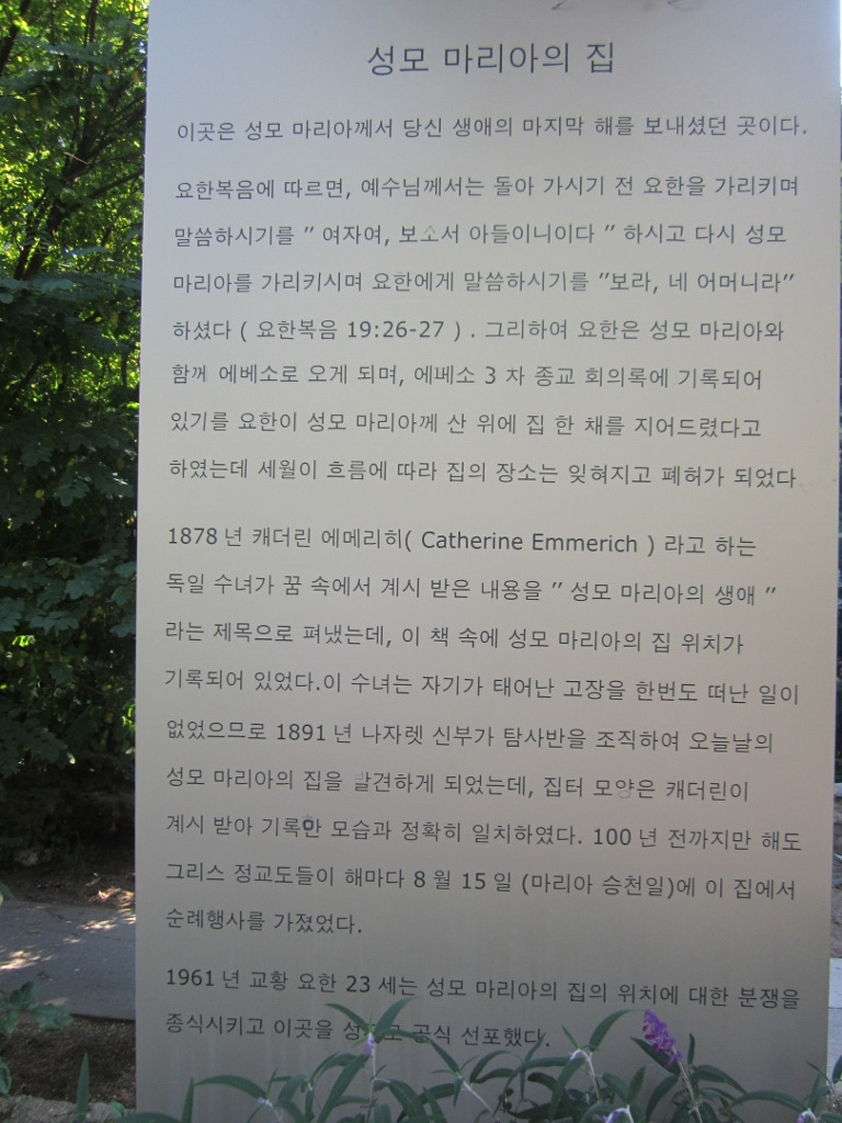입구에서 사람들을 내려다보고 있는 마리아 상을 지나면 각국 언어로 번역된 "마리아의 집(Meryemana)" 설명을 볼 수 있다. 한국어도 그 틈에 있는 걸 보고 새삼 우리나라에도 참 많은 기독교 인구가 있구나 싶었다. 게다가 외국에서 흔히 볼 수 있는 괴상한 번역이 아니라 깔끔한 번역물을 보니 이곳에 많은 신경을 썼다는 걸 알 수 있다.
