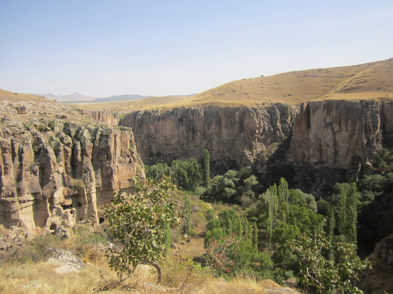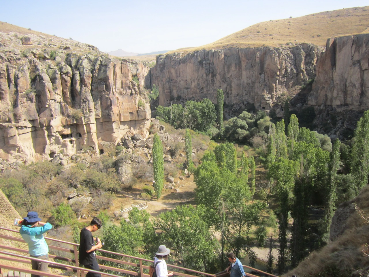 셀리메 동굴 수도원을 나와 다시 사람들이 숨어 살았던 다음 곳, '으흐랄라 계곡 Ihlara Valley'으로 갔다. 약 2,000년 전에는 기독교도들을 죽이려고 그 뒤를 쫓았던 사람들이 있었는데, 21세기에 사는 우리들 역시 그 사람들의 흔적을 찾아 이곳으로 온다. 계곡이라고 해서 시원하게 쏟아지는 물줄기를 기대하면 오산이다. 사람들이 발을 담글 수 있을 정도의 개천. 그 정도가 딱 적당하다. 그보다는 이곳의 물줄기를 둘러싸고 있는 암벽의 풍경이 아름답다. 그래서 원래 이름도 계곡이 아니라 협곡이었다는. 역시나 사람들 눈에 잘 띄지 않는 협곡이기에 기독교인들이 교회를 짓고 살기 시작했다. 게다가 종교 탄압이 끝나고 나서도 속세와 떨어져 살기 위해 이곳에 산 수도사들도 많아서 이곳에선 거의 1000년 간 사람들이 살았다고 한다. 과연 성지순례로 올만한 곳이지 싶다.