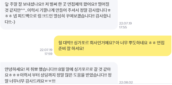 여기서 잠시 민O님에 대해 말씀드리자면 이번에 일본에서 대학교를 졸업하시고 싱가포르에서 첫 직장 잡는 것을 목표로 하셨다. 본격적으로 취직 준비를 하신지 한 달만에 유명 기업의 영업관리직에 최종 합격하신 후 비자 진행을 하며 싱가포르에 갈 준비로 바쁘게 지내고 계신다.