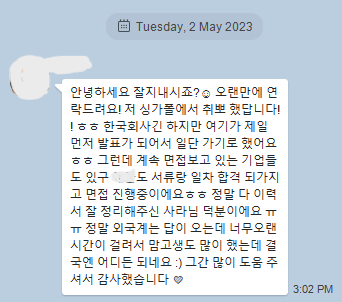 저희의 인터뷰가 끝난 후 얼마 지나지 않아 글로벌 IT기업에서도 최종 잡오퍼를 받았다는 좋은 소식을 전해주셨어요. 행복한(!) 고민 중에 계신데 아무쪼록 즐겁고 알찬 싱가포르 생활을 하시면 좋겠습니다. ^^