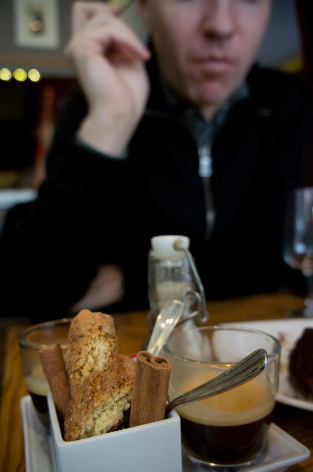 나는 아직 이 경지에는 이르지 못해서 달콤한 디저트와 에스프레소를 시켰지만 이들이 왜 이러는지는 이제 이해할 수 있다. 아래 사진은 남편의 마무리 김치 한 조각, 치즈 플래터이다.