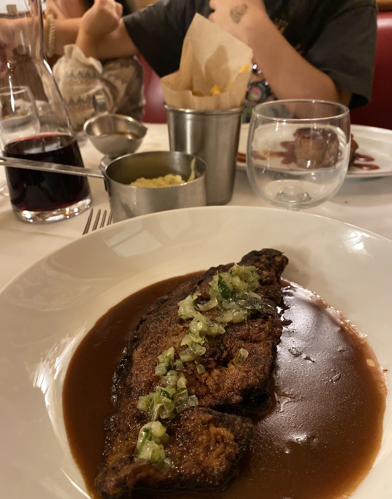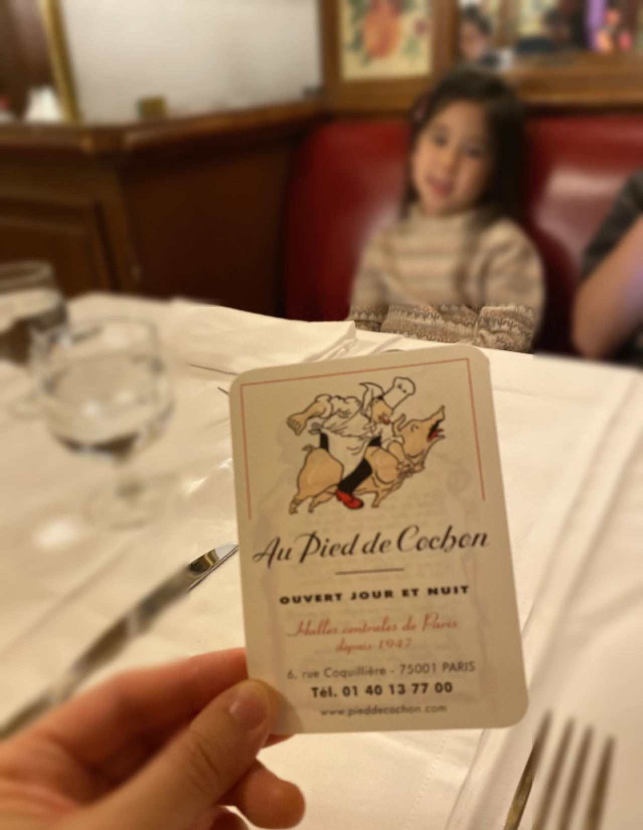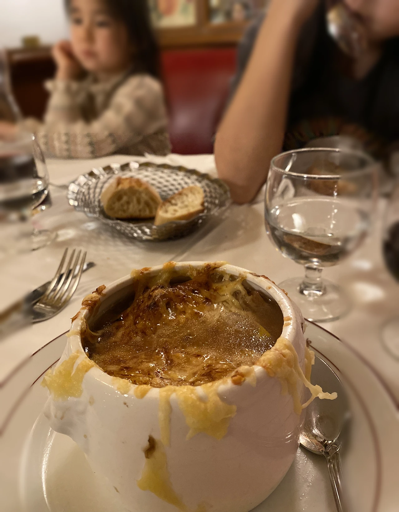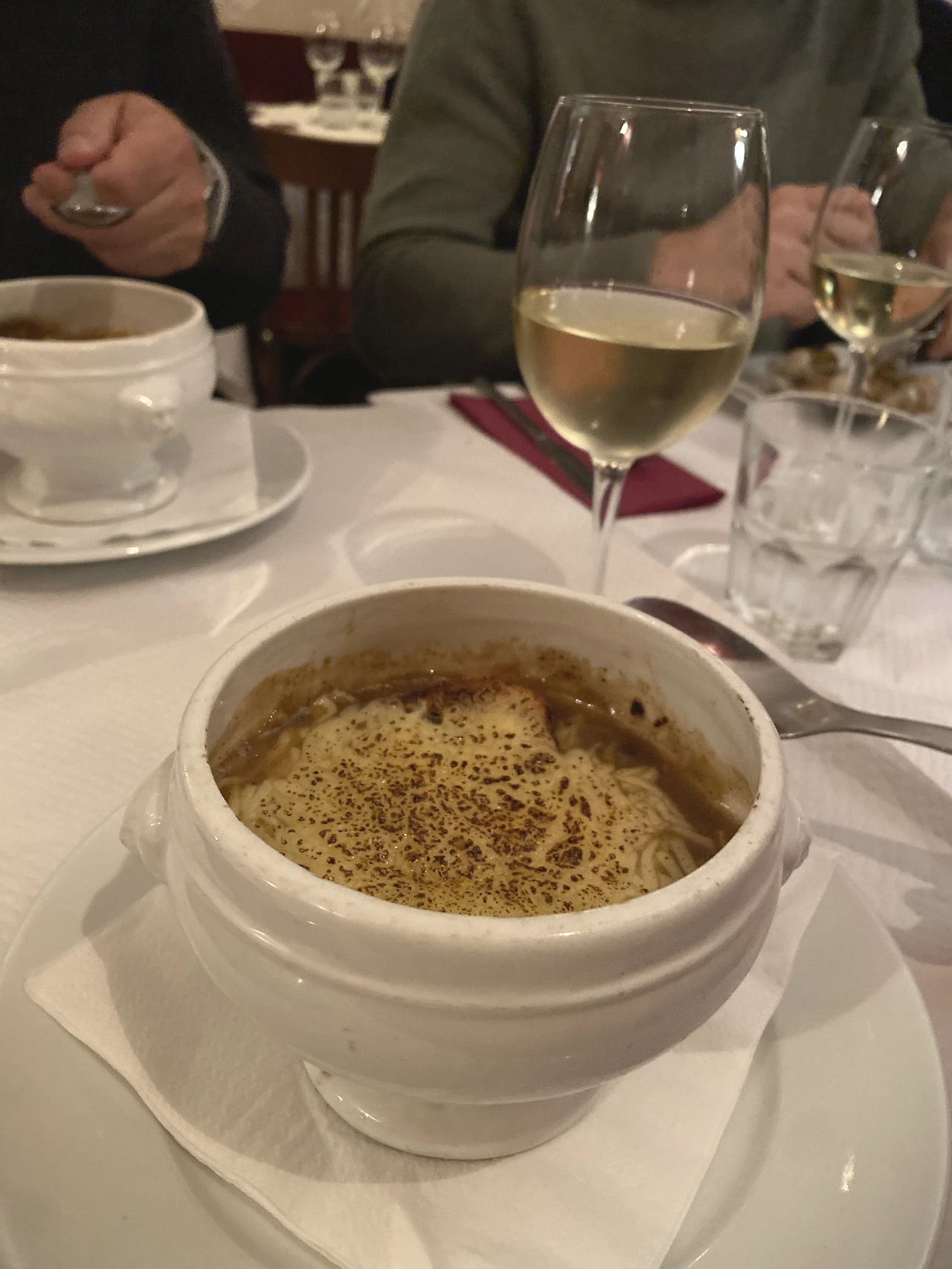 여기는 처음 가보았는데 저녁 시간이 되니 길게 늘어져 있는 줄에 기대를 하며 들어갔던 곳. 1947년부터 있었던 레스토랑으로 인테리어가 정말 뜨아! 파리! 로맨틱하고 화려하다. 프랑스 전통 요리 중에서도 돼지고기 요리를 주로 하는 곳이긴 한데, 내가 먹은 송아지간 요리도 손에 꼽히게 맛있었음. 이곳에서도 나는 양파수프는 참지 못하고 시켰는데 시키길 잘했음.