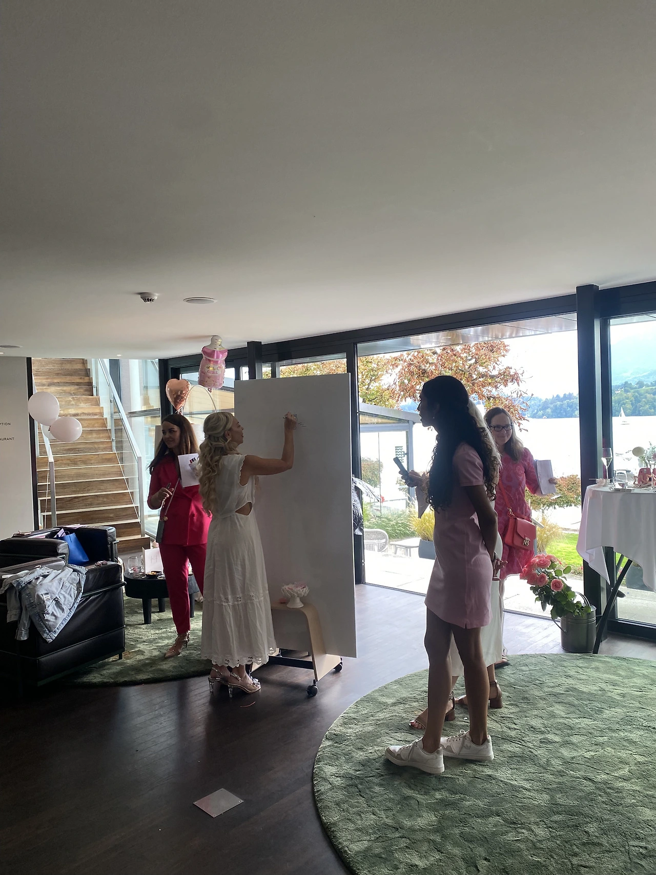 오늘의 파티 장소는 선선한 바람이 불어오는 루체른 호숫가에 위치한 곳으로 저 멀리에는 알프스 설산이 보이고 파아란 하늘에 초록 잔디, 반짝이는 윤슬의 3단 콤보로 이보다 더 좋을 수 있을까?! 눈에 담는 것만으로 행복지수가 올라가는 곳이다.