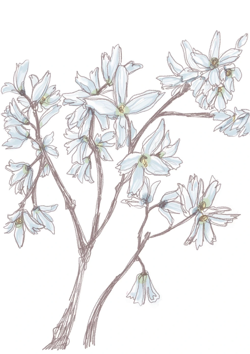 우선, 나의 졸업작품의 메인 주제인 '미선나무'를 다루지 않을 수 없다. 개나리와 비슷하면서도 훨씬 고운 빛에 옅은 흰색과 4개의 잎이 달린 꽃의 형체가 인상 깊었다. 그렇게 무엇에 홀린 듯, 나는 아이패드로 열심히 그림을 그렸고, 위의 이미지는 나의 웹에서의 3D space에서 어떻게 시각적으로 다가올지 실험하기 위해 배경 투명화를 하여 3D 공간에 올려 보았다. 생각보다 2D 일러스트와 3D 배경의 조합이 굉장히 좋게 다가왔고, 여러 교수님들의 호평 속에서 나는 시각적으로 2D와 3D의 결합이 생각보다 성공적이다!라는 확신을 가질 수 있었다.