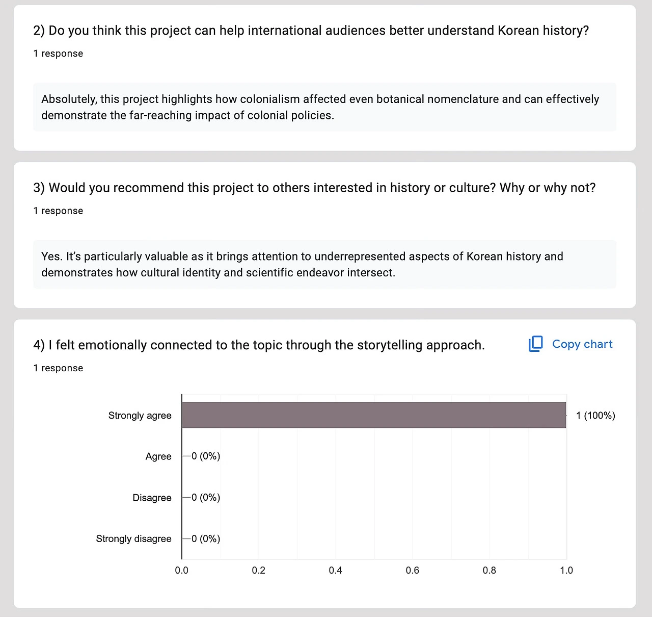 그리고 마지막으론 Open Studio라고 해서, 학기말 과제전이란 전시회를 여는데 이는 학과 사람들 뿐만 아니라 외부 타과 학생들 또한 방문하여 자유롭게 질의응답을 한다. 감사하게도 나의 부스에 비교적 2시간이란 짧은 시간에도 불구하고 관심을 가져주신 분들이 계셔서 그분들을 위해 전시회용으로 준비한 15분용 PPT로 간단한 배경지식을 이야기해 드린 뒤, 나의 웹 개발 현황과 포스터, 그리고 만화 등을 보여드리고 마지막으론 간단한 설문 QR 코드가 들어간 포스트 카드를 선물로 드렸다. 과제전을 통해 나는 생각보다 외국인들이 우리나라 역사에 대해 관심이 많다는 것, 특히 일제강점기가 언제 일어났냐는 연도에 대해 제일 많이 질문을 받았고 이를 통해 정말 중요한 역사적 연도는 무조건 외워야겠단 의무감이 일었다. 너무 감사하게도 전시회에 오셨던 한 분께서 정성스러운 답변을 해주신 덕분에 더더욱 나의 프로젝트를 잘 마무리해야겠다는 생각이 들었다.