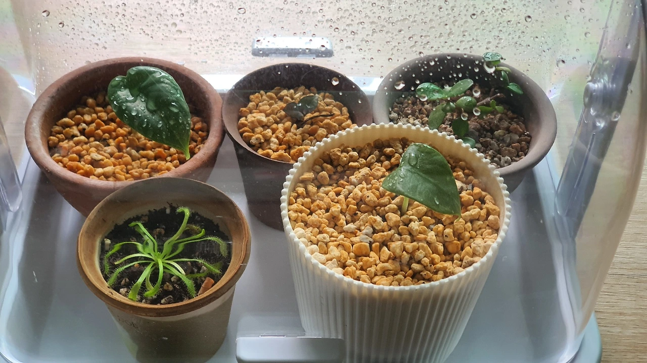 나의 알로카시아 실버 드래곤 자구 두 개는 무사히 잎들을 틔워 지금은 식물 온실 안에서 지내고 있다. 식 집사 분들 사이에서 이미 유명한 국민 온실을 나도 드디어 구해서 은행목 가지, 끈끈이주걱 새끼, 블랙 금전수 싹들과 같은 작은 친구들을 넣어주었다. 옹기종기 사이좋게 모여있는 모습이 너무나 귀엽고 사랑스러워 견딜 수가 없다. 그리고 9월을 맞이하기 전 새롭게 들여온 식물들도 몇 가지가 있는데 나중에 소개해보도록 하겠다.
