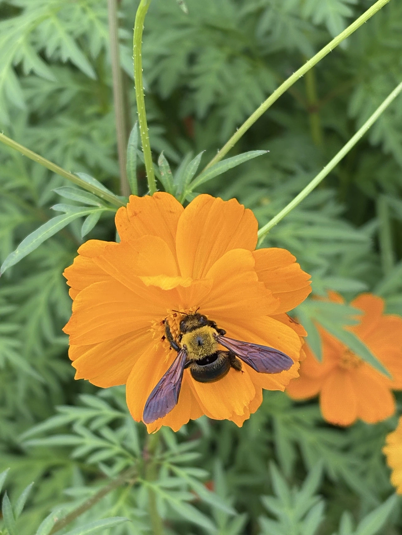 꽃잎 사이를 날아다니는 어리호박벌 한 마리가 눈에 들어왔다. 그 벌이 코스모스의 꿀을 빠는 모습은 마치 아기가 엄마 품에 안겨 젖을 빠는 듯 다정하고 평화로웠다.