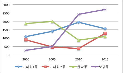 젠트리피케이션이 활발하게 일어나고 있는 이태원 1,2동과 한남동의 경우, 내국인 주민등록인구수는 감소하였다. 그러나 상대적으로 젠트리피케이션의 속도가 아직 빠르지 않고 거주환경이 상대적으로 열악한 보광동은 내국인 주민등록인구수가 감소, 증가, 감소를 반복하고 있는 것이 발견된다. 그러나 보광동의 외국인 주민등록인구수는 2005년 이후 급격하게 증가하고 있어 임대료가 저렴한 곳으로 외국인들이 밀집되는 것을 알 수 있다. 이태원 2동의 경우에도 2010년 이후 감소 추세에 있던 외국인 주민등록인구수가 크게 증가한 것으로 나타난다.