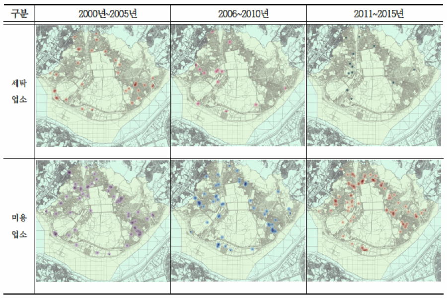 미용업소의 경우에는, 2006년-2010년에 전반적으로 감소된 것을 알 수 있고, 특히 보광동 인근에서 줄어드는 것이 나타나지만, 이태원로에서는 증가하는 것으로 나타난다. 그리고 2011년-2015년에는 이태원에 전체적으로 다시 증가하는 경향을 보여준다. 이는 트렌드의 변화에 민감한 미용업소의 특성상 개점과 폐점이 지속적으로 이루어진 것으로 추측할 수 있으며, 이태원에서 다양한 헤어스타일이 인기를 끌고 있는 것과 연관 지어 볼 수 있다. 2016년 매일경제 신문에서 언급된 이태원의 나이지리아 거리의 명물로 소개되는 레게머리 전문 미용실을 일례로 들 수 있다.