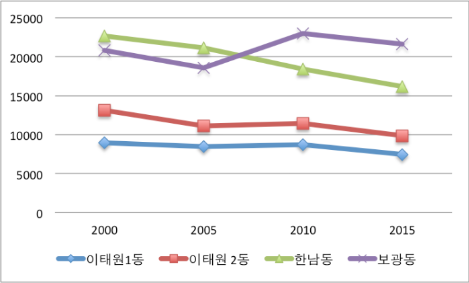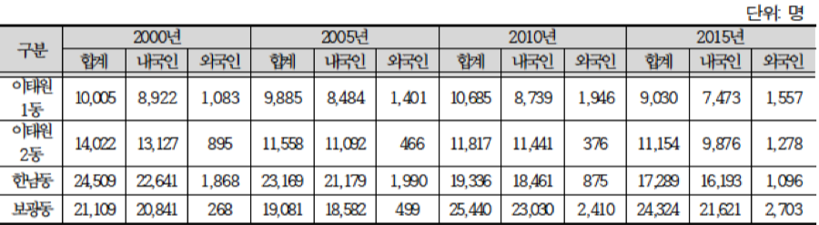 이태원 지역의 주민등록인구의 변화를 살펴보면, 이태원 1,2동과 한남동의 경우 전반적으로 인구가 감소하고 있는 추세다. 이태원의 주민등록인구변화 추이를 표로 정리한 것을 살펴보면, 내국인의 감소가 주민등록인구의 변화에 상당 부분 기여한 것을 볼 수 있다. 외국인의 경우, 주민등록인구의 변화에 다소 기복이 있지만, 이태원 1,2동과 보광동은 2000년대에 비교하여 2015년에 증가하였고, 한남동은 감소한 것을 알 수 있다.