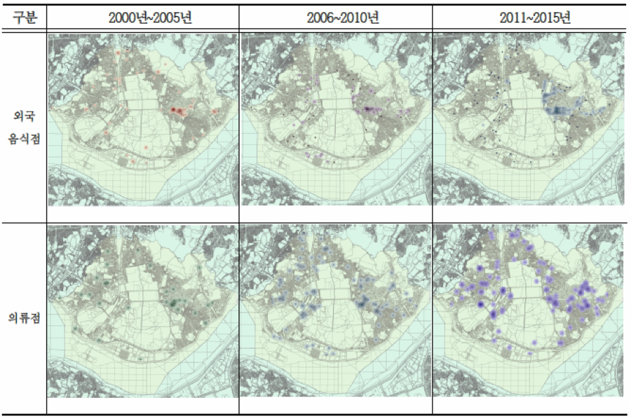 외국음식점의 경우, 2000년-2005년에는 이태원역 근처에 집중되어 있지만, 2010년 이후 이태원로를 중심으로 점점 그 밀도와 범위가 확장되어 가는 것을 알 수 있다. 또한 2011년-2015년에는 경리단길까지 외국음식점의 분포가 확산되는 것을 알 수 있다. 의류점의 경우에도 외국음식점과 마찬가지로 용산구 내에서 증가 추세를 보여주고 있다. 특히 2011년-2015년에는 이태원로에서 꼼 데 가르송 길과 한남동 일대까지 밀도와 분포가 급격하게 증가한 것을 알 수 있다.