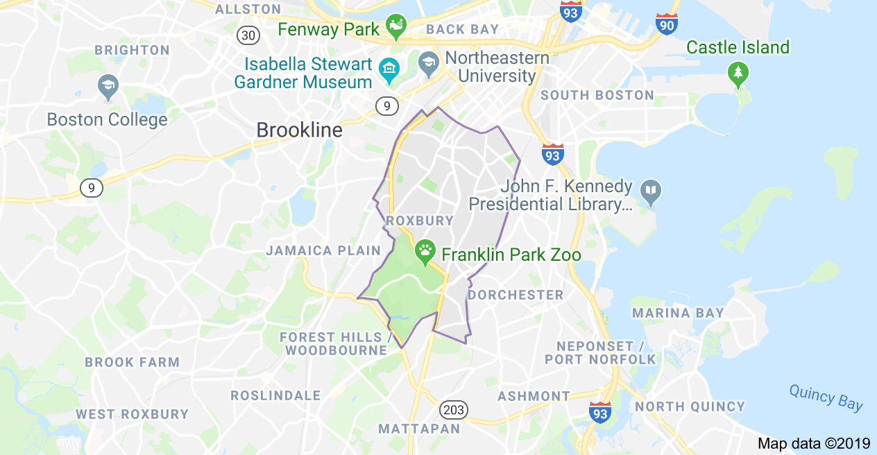 록스베리는 보스턴시에서 가장 쇠퇴한 지역 가운데 하나로, 주민들의 대부분이 흑인이다. 록스베리는 17세기에 영국인들에 의해서 만들어진 곳으로, 19세기 중반에 보스턴시에 병합되었다. 이곳은 미국 사람들이 산업혁명을 겪으면서 보스턴의 중심부에서 벗어나 전원에서의 생활을 위해 이주하면서 본격적으로 활기를 띄기 시작한 곳이다. 록스베리는 보스턴의 중심부에서 출퇴근이 가능하고 토지 가격이 비교적 저렴했기 때문에 인기가 있었다. 록스베리의 상업활동은 더들리 광장(Dudly Square)을 중심으로 이루어졌으며, 보스턴 지역에서 소매상인들에게 가장 인기가 있는 지역이었다. 더들리 광장에는 록스베리와 보스턴의 중심지를 연결하는 기차역이 생겼으며, 여러 가지 사회 경제적인 활동으로 활기가 넘쳤다.