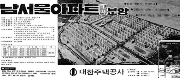 반포주공 아파트는 1973년 대한주택공사가 건설한 최초의 주공아파트 단지였다. 총 99개 동으로 된 대규모 아파트 단지로 평형도 22평부터 62평까지 매우 다양했다. 국내 최초로 복층 설계를 도입하였을 뿐만 아니라 지역난방시설도 설치한 최신형 아파트였다. 분양 당시 반포주공 아파트의 이름은 서울의 남쪽에 위치한 아파트라는 의미의 '남서울 아파트'였다. 분양 광고에는 서울의 사대문 안인 남대문과 서울시청에서 멀지 않다는 점을 강조했다.