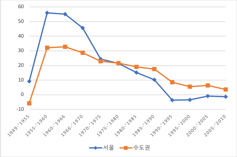 그림 1. 서울과 수도권의 인구증가율(1949-2010)