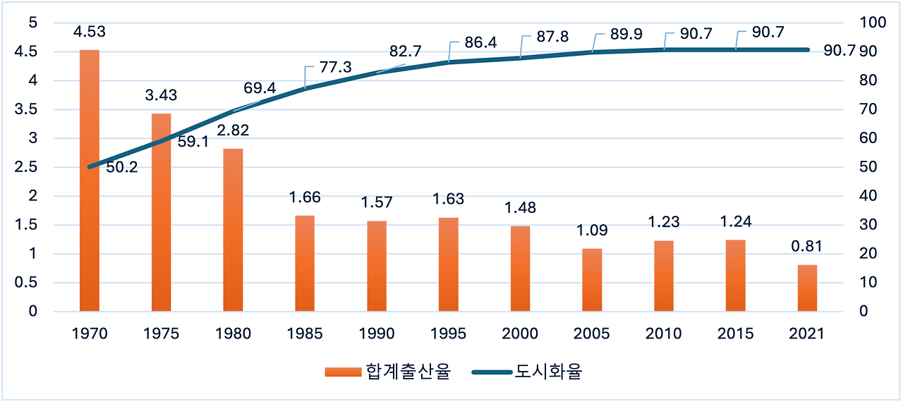 <그림 2> 우리나라 합계출산율과 도시화율 추이(1970~2021)