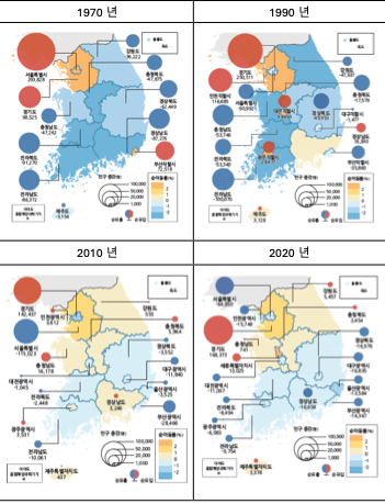 1970년대 중반 산업화 시기 이후 현재까지 우리나라에 나타난 인구이동은 농촌 지역에서의 매우 심각한 인구유출과 수도권 지역으로의 지나친 인구유입으로 나타나고 있다. 시도별로 살펴보면, 1975년 대비 2020년 인구가 증가된 지역은 경기(340%), 세종(236%), 인천(205%), 울산(201%)이며, 동기간 인구가 감소된 지역은 전남(-45%), 전북(-27%), 경북(-21%), 강원(-18%)이다. 시군구 행정구역을 기준으로 좀 더 자세히 살펴보면, 인구가 가장 많이 감소한 지역은 전남 신안군(-78%), 경북 영양군(-77%), 전북 진안군(-76%), 전남 보성군(-76%), 강원 정선군(-75%) 등으로 대부분 농촌 지역이다. 한편, 인구유출은 농촌지역뿐만 아니라 서울, 부산, 대구, 인천, 광주, 대전 등의 대도시 중심지(원도심)에서도 많이 일어났다.