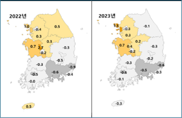 2022년 정부의 위드코로나 정책 실시 이후, 시도별 인구순이동에 변화가 있었다. 2023년 통계청에서 발표한 ‘2023년 국내인구이동통계 결과’에 따르면, 2022년 대비 순 유입률이 증가한 시도는 대구(0.3% p), 울산(0.3% p), 인천(0.2% p), 충남(0.1% p), 부산(0.1% p), 경남(0.1% p) 순이고, 순 유출률이 증가한 시도는 세종(-2.2% p), 제주(-0.7% p), 강원(-0.6% p), 광주(-0.1% p), 충북(-0.1% p), 전남(-0.1% p) 순으로 나타났다. 2023년 눈에 띄는 인구순이동은 인구의 순 유입이 있었던 세종과 강원, 그리고 제주 지역에 순 유출이 증가하고 대구, 울산, 부산 등의 대도시에 순 유입이 증가한 것이다. 서울의 경우는 총 전입과 총전출이 같아 전년대비 증감률은 0.0% p로 나타났다.