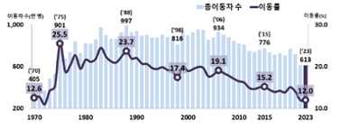 <그림 6> 우리나라 이동자 수 및 이동률 추이(1970~2023)