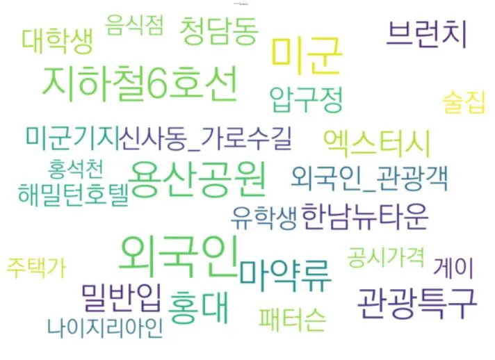 2001년에서 2010년까지 5,088건의 기사를 대상으로 분석하여 추출한 이태원 관련 키워드를 살펴보면, 지하철 6호선, 브런치, 용산공원, 압구정, 신사동_가로수길, 나이지리아인 등으로 당시의 이태원에서 증가하고 있는 나이지리아인과 브런치를 즐길 수 있는 장소로 이태원이 강남의 가로수길과 압구정동과 비교되어 나타나고 있음을 알 수 있다.