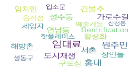 2015년부터 현재까지 280건의 기사를 대상으로 분석하여 추출한 '이태원 젠트리피케이션' 관련 키워드는 임대료, 핫플레이스 등이며, 이태원과 비슷한 젠트리피케이션이 나타나고 있는 성수동, 연남동, 해방촌도 함께 기사화되고 있음을 알 수 있다.