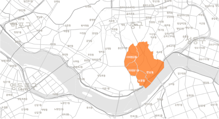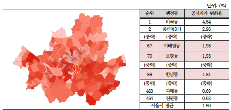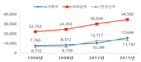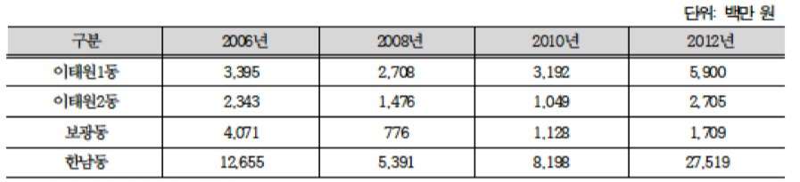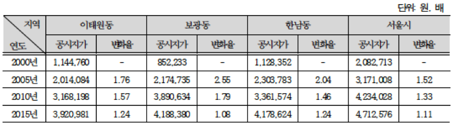 이태원 1,2동 , 보광동, 그리고 한남동의 2005년부터 2015년까지 10년 동안의 평균 공시지가 변화를 살펴보면, 이태원동의 경우, 1.95배, 보광동은 1.92배, 그리고 한남동은 1.81배 증가한 것을 알 수 있다. 서울시 동별 전체 평균 공시지가 상승률이 1.6배 정도인 것과 비교하면 이태원 지역의 평균 공시지가 증가율이 더 높은 것으로 나타났다.