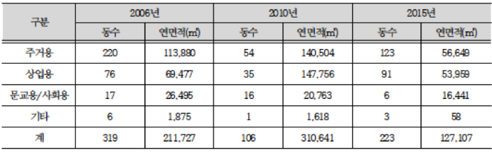 실제로 이태원의 건축행위 신고건수 변화를 살펴보면, 전체적으로는 2006년에서 2010년 사이에는 감소하지만 2015년으로 가면서 증가하고 있음을 알 수 있다(표 참조). 또한 주거용과 상업용 건물의 건축행위가 주를 이루는데, 그중에서도 눈여겨볼 만한 것은 2006년도에 비해 2015년에는 주거용 건물의 인허가 동수는 감소하였지만, 상업용 건물은 증가하였다는 점이다. 2010년에는 주거용과 상업용 건물의 인허가 건수가 전반적으로 줄어드는 것이 발견되는데, 이는 2008년 세계경제위기에 따른 부동산 불경기에 기인한 것으로 짐작된다. 또 다른 주목할 점은 2006년에서 2010년 사이에 상업용 인허가 연면적이 2배 이상 급격하게 증가했다는 점이다. 이는 기존의 주거용 건물들이 증개축을 통해 근린생활시설과 같은 상업용도로 용도가 변경되는 것을 간접적으로 볼 수 있다.