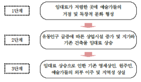 서울시 젠트리피케이션 종합대책에 나타난 상업공간 젠트리피케이션의 특성을 다시 한번 살펴보면 다음과 같다. 먼저, 1단계에서는 임대료가 저렴한 구도심에 공방, 갤러리 등 예술가들이 활동하고 머물 수 있는 거점이 생기고, 이러한 공간들을 따라 카페, 식당 등의 시설들이 자리를 잡아 해당 지역만의 독창적인 문화가 형성된다. 다음으로 2단계에서는 이러한 장소들이 인기를 얻게 되면서, 유동인구가 급증하게 되고 대형 프랜차이즈를 기반으로 하는 커피 전문점, 음식점 등 상업시설이 따라서 증가하게 된다. 이에 대한 결과로 기존 건축물의 용도변경으로 인한 지가와 임대료가 급등하는 과정을 거치게 된다. 마지막 3단계에서는 급등한 지가와 임대료로 인해 문화, 예술가 집단, 영세자영업자, 기존 원주민까지 외부지역으로 이주하게 됨으로써 지역 정체성과 장소성이 상실되는 결과를 가져오게 된다. 이러한 과정을 도식화하면 다음과 같다.