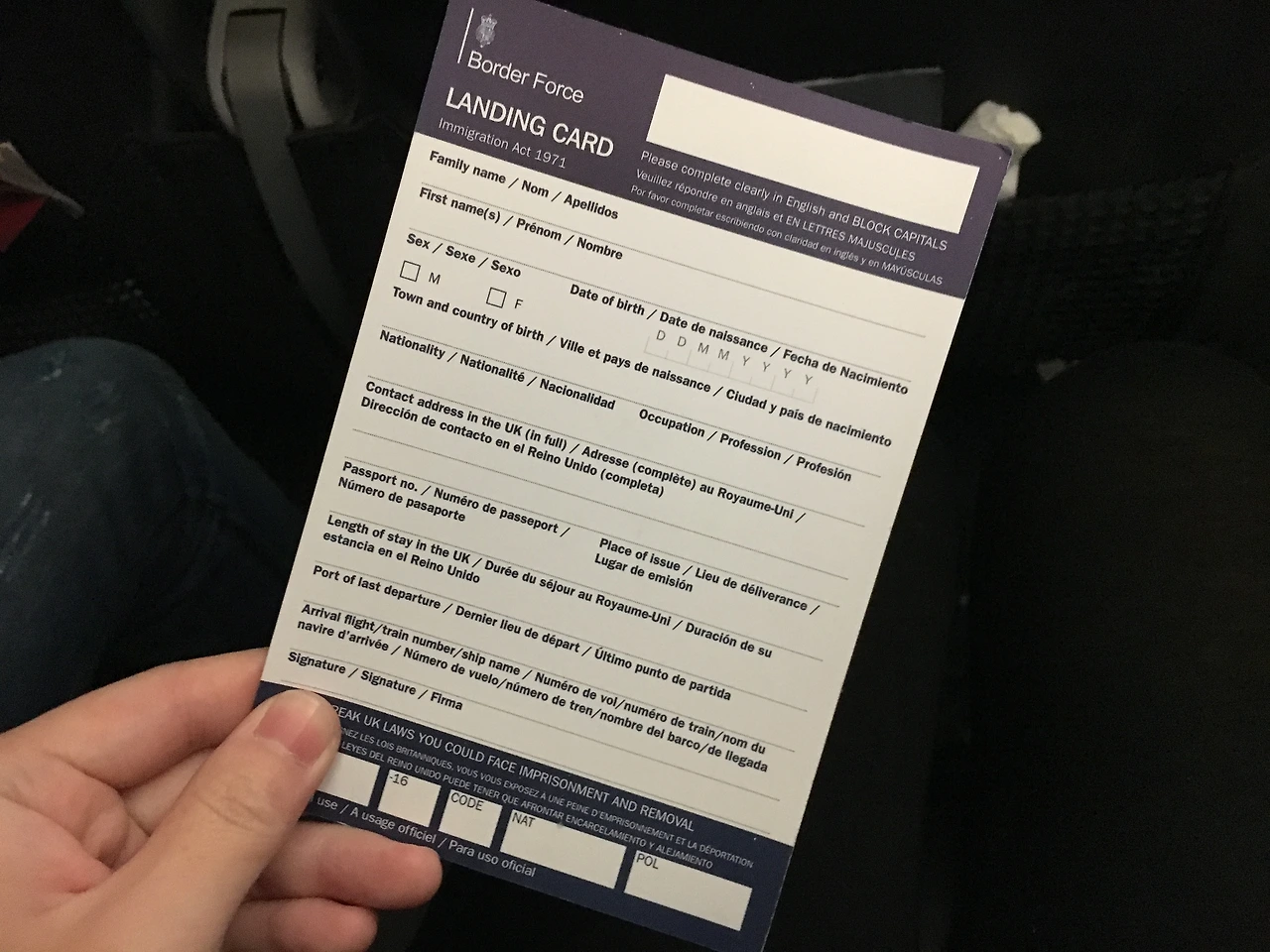 도착 시간까지 약 15분이 남자, 승무원이 랜딩 카드를 나눠주기 시작했다. 물론 모두에게가 아니라 필요한 사람에게만. 여기서 필요한 사람은 EU 국가 국적 이외의 사람 중에 히드로 공항이 도착지인 사람이었다. 나는 히드로는 경유지였기 때문에 필요하지는 않았지만, 랜딩 카드가 어떻게 생겼는지 궁금해서 한 장 부탁했다. 나 이외의 대부분의 사람들은 딱히 이 카드가 필요하지 않은 거 같았다. 승무원이 통로를 걸으며 필요한 사람을 부르는 동안 손을 든 탑승객이 나를 포함해서 3명밖에 없었으니.