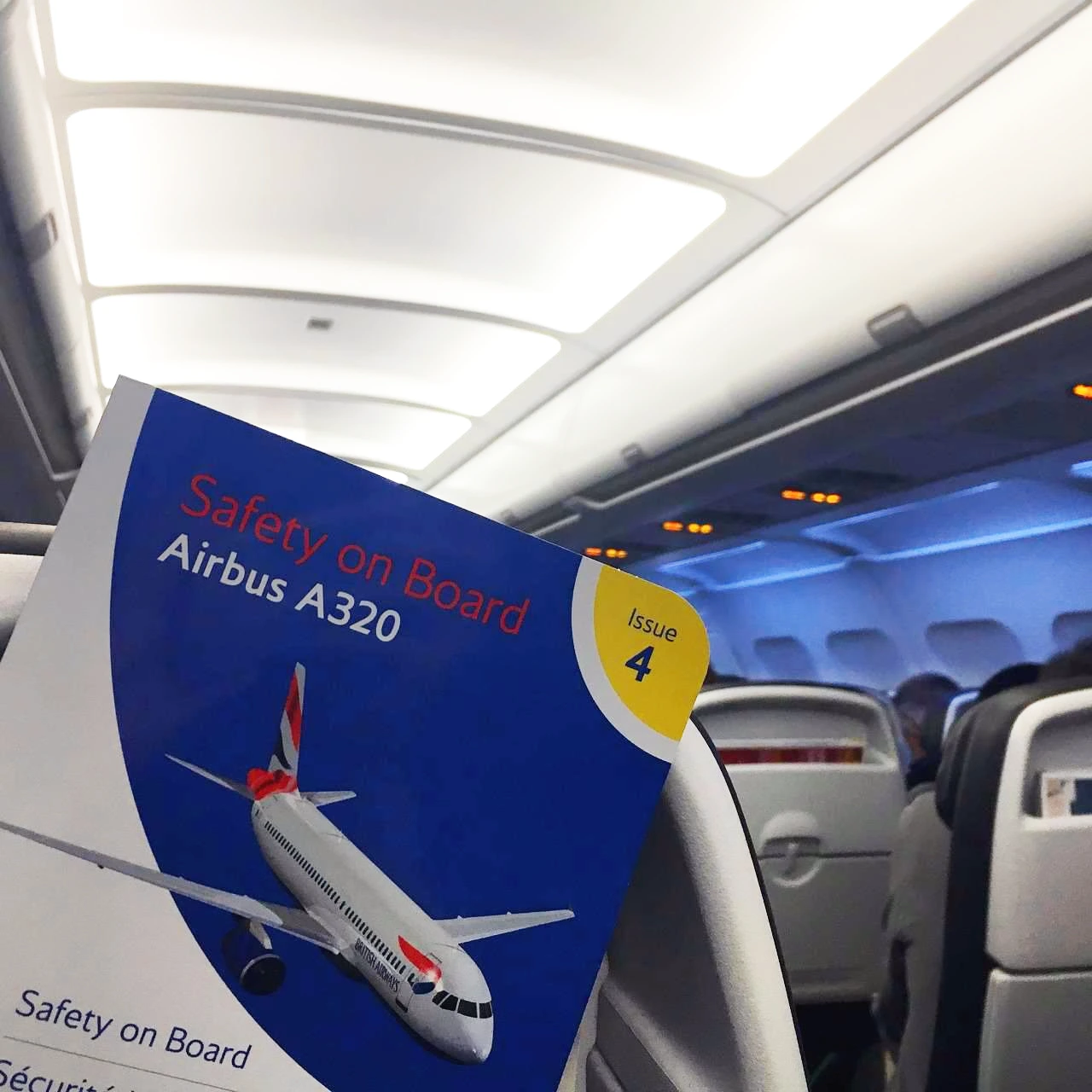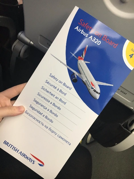 영국항공의 안전가이드 표지에는 영어를 포함한 7개 국어로 Safety on Board가 쓰여 있었다. 영어, 프랑스어, 독일어, 이탈리아어, 포르투갈어, 스페인어 그리고 러시아어 순이다. 제일 신기했던 건 러시아어가 쓰여 있다는 점이었다. 보통 형평성이나 이용고객수를 생각하면 중국어가 쓰여있는 게 일반적이라고 생각해왔는데, 영국항공은 그렇지 않았다. 에어버스 A320이 중단거리용 항공기라는 점을 생각하면, 영국을 거점으로 중단거리로 갈 수 있는 곳은 멀리 가봤자 유럽과 러시아밖에 없고, 그렇게 되면 유럽 대륙 내는 거의 에어버스가 운항될 것이다. 그런 의미에서 형평성과 이용고객수(인구수)를 고려해서 러시아어를 넣었을지도 모른다. 보잉이 쓰이는 장거리 항공편 세이프티 가이드에는 어쩌면 언어 구성이 다를 수도 있다. 나중에 기회가 된다면 일본이나 한국에서 영국공항을 탔을 때 또다시 한번 확인하고 싶다.
