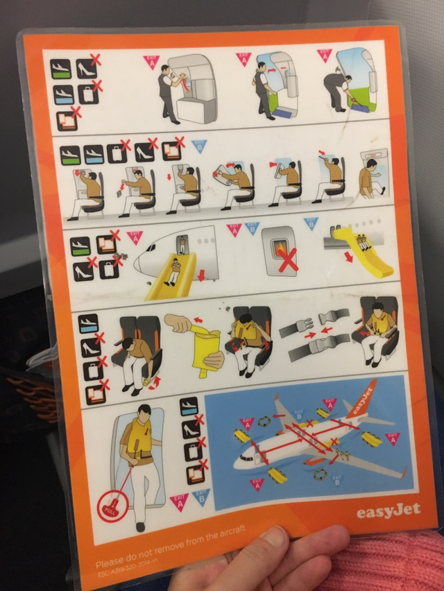 이전 포스팅에서도 강조했지만, 비행기에서 제일 중요한 건 안전제일이다. 이지젯의 세이프티 가이드는 심플하게 양면 프린트 한 장으로 정리되어 있었다. 최소한의 정보들이 정리되어 있었지만, 아무래도 일반 에어라인 세이프티 가이드보다는 간략하게 설명이 되어 있어 있어서 처음 보는 사람에게는 조금 이해하기 어려울 것 같기도 하다.