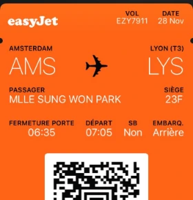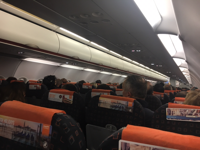 좌석 배치는 3:3, 좌석 위 선반 그리고 좌석 간 간격도 일반 유럽 에어라인보다 좁고 작은 게 인상적이다. 이지젯은 여타 항공사보다 기내 수하물에 대한 규정이 조금 까다로운 편인데, 아마 좁은 공간 안에 모두가 평등하게 수하물을 가져다 놓을 수 있도록 하기 위함이 아닐까 싶다. 탑승객 남녀 비율은 거의 반반이었고, 연령대도 다양했다. 저가 항공사라 그런지 내 또래로 보이는 젊은이도 많았고, 그 반대로 40대 이상 돼 보이는 사람도 곳곳에서 보였다. 다만 연령대가 높은 분들 중에서는 남성 비율이 훨씬 더 높았던 게 인상에 남는다. 리옹행이라 그런지 네덜란드어보다는 프랑스어가 훨씬 더 많이 들렸다. 그리고 이건 프랑스를 오고 가는 이지젯 항공편만의 특징일 수도 있는데, 이용객 중에 알제리아, 튀니지, 모로코 등 마그레브 지역 계열 사람들이 정말 많이 이용한다. 그래서 아랍어로 추정되는 언어가 정말 많이 들려온다. 내 옆자리에 앉았던 가족도 그랬다. 승무원에게는 영어로(이 날 탔던 비행기 승무원 중에는 네덜란드어 스피커는 있었어도 프랑스어를 할 수 있는 승무원은 없었다.) , 내게 뭔가 물어봐올 때는 프랑스어로, 그리고 부부 두 명이서 대화를 나눌 때는 아랍어로 얘기가 오고 갔었다. 그리고 그들과 함께 그들의 딸도 앉아 있었는데, 어린이가 아직 3살 정도밖에 안돼서 그런지 그녀를 위한 자리를 따로 마련하지 않고 그녀의 엄마 무릎에 앉아 있었다.