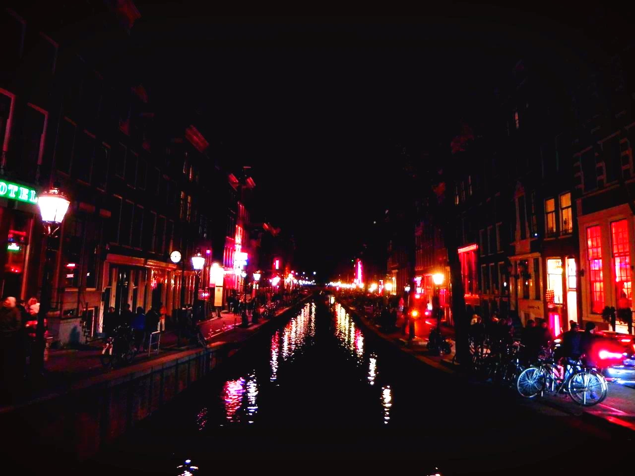 아직 저녁 6시 30분이었지만, 가게들은 밤을 맞이해서 이미 조명을 밝게 키며 손님들을 맞이하고 있었다. 붉은색, 분홍색, 가끔 보이는 보라색 조명이 은밀하게, 그리고 당당하게 빛나고 있었다. 가다가다 보이는 성인용품 샵들도 자극적인 쇼윈도로 지나가는 행인들의 이목을 사로잡곤 했다. 가운데에 흐르는 운하에 비치는 길거리의 모습이 진짜 밤의 서막을 알리는 것만 같았다.