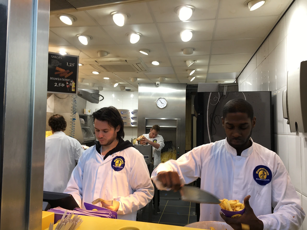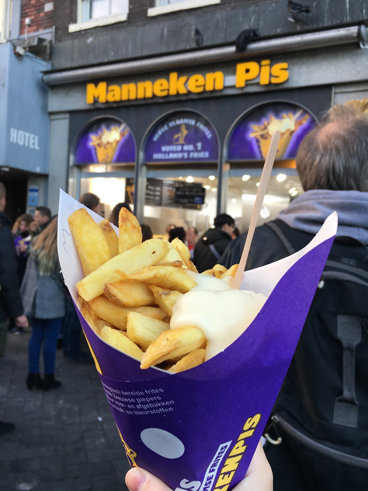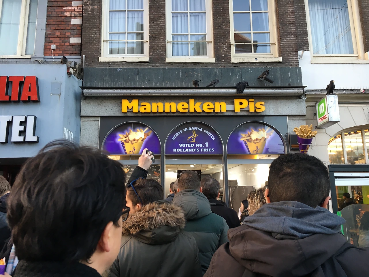 물론 지금 당장 매춘과 마약의 거리로 향하기에는 해가 너무 밝게 떠있었기에, 난 먼저 배고픈 배를 달래며 먹을 것을 찾아 나섰다. 아니, 찾아 나섰다기보다는, 이미 인터넷으로 찾아놨던 가게로 향했다고 하는 게 더 맞는 말인지도 모르겠다. 수많은 암스테르담 여행 후기 추천 리스트에 이름이 올라가 있는 감자튀김 가게, <마네킨 피스>. 네덜란드에서 무려 1위의 영광을 누린 감자튀김 집이라고 한다. 누가 1위 아니랄까 봐, 가게 앞에는 많은 관광객들로 북적였다. 그래도 시기 자체가 비수기인 데다가 대기줄이 생각보다 금방 금방 짧아지기에, 나도 망설임 없이 줄을 섰다. 메뉴도 다른 가게들에 비해 간단하여 주문하기도 편하고, 직원들도 다 영어를 할 줄 알아 언어로도 주문이 곤란할 일도 없었다. 오후 4시라는 애매한 시간이었지만, 이 날 먹은 게 아침으로 호텔에서 먹은 뷔페가 다였기에, 이왕 이렇게 된 거 점심 저녁 겸해서 오늘 이거 하나로 끼니가 다 해결되도록 미디엄 사이즈를 주문했다. 마요네즈 소스와 함께.