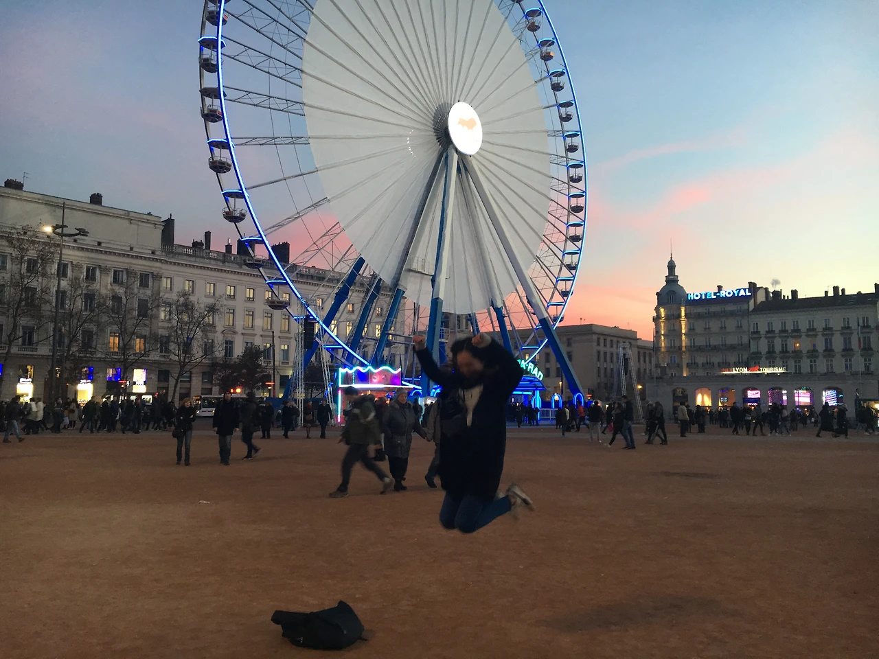 뭐 그래도, 광장 한가운데에 존재감을 뽐내는 관람차의 위엄은 앞으로의 밤에 대한 기대감을 높였다. 빛의 축제가 본격적으로 시작하는 게 저녁 8시라, 우리들은 광장 중앙에 앉아 각자 가져온 저녁을 먹었다. 물론, 각종 와인과 맥주도 함께.