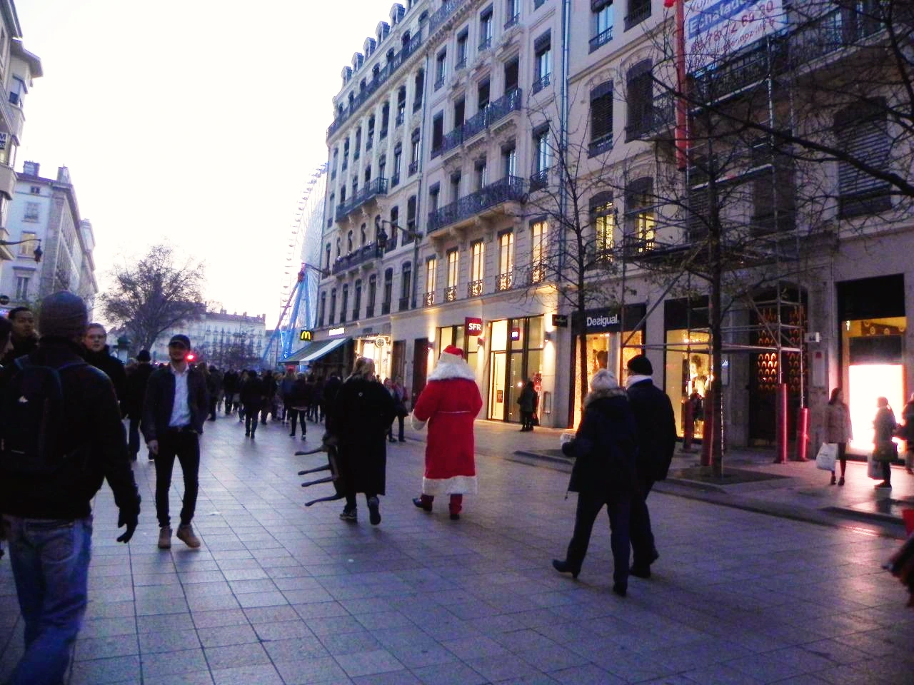 오후 15시경에 도착한 후, 우리는 리옹 시내를 돌아다녔다. 리옹도 많은 거리들이 크리스마스 장식으로 예쁘게 꾸며져 있었다. 아직 밝은 오후라 그 모습은 보이지 않지만, 이 거리들도 밤이 되면 아름다운 빛들로 가득한 축제의 거리로 변신하겠지. 그런 기대감을 부푸며 셔터를 누르며 친구들의 뒤를 따라갔다. 길거리 한복판에서 서성이며 지나가는 사람들 앞에 불쑥 나타나며 우리들의 이목을 사로잡는 산타 분장 아저씨를 바라보며, 우리는 벨쿠르 광장으로 향했다.