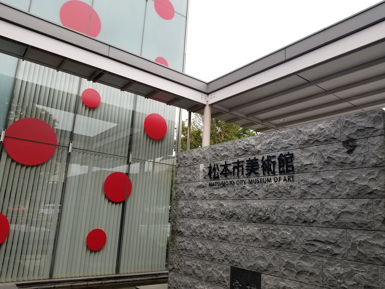 미술관 자체는 시에서 운영하는 시립미술관이라 그녀의 이름은 안걸려 있었지만, 그녀의 고향답게 건물 외관은 온통 쿠사마 야요이의 세계관에 뒤덮여 있었다.