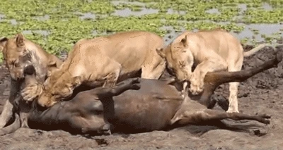 사자는 덩치 큰 물소를 한번 물기 시작하면