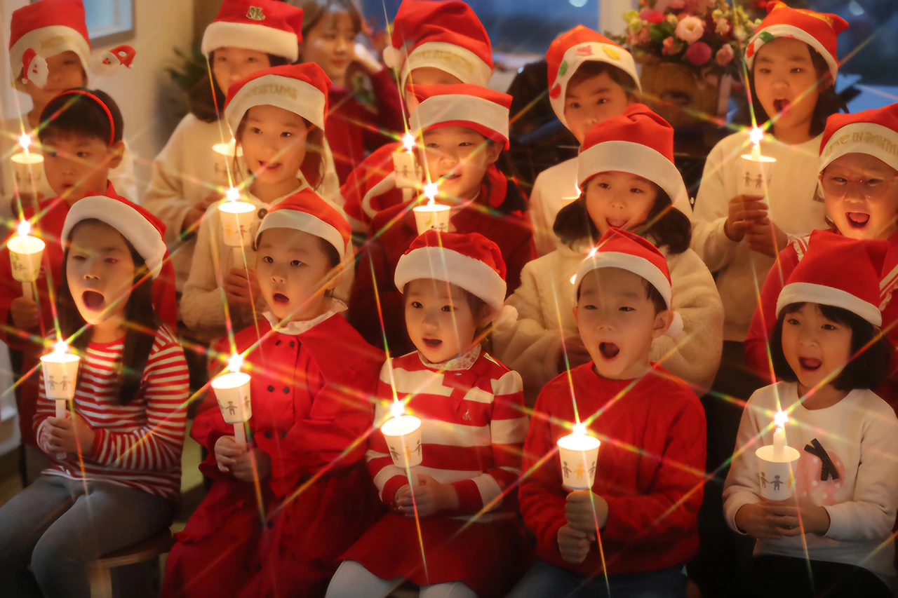 작은 크리스마스 트리에 초를 켠 불빛이 반짝이더니, 이내 낮은 목소리로 "고요한 밤, 거룩한 밤" 캐럴이 들려왔습니다.
