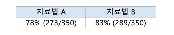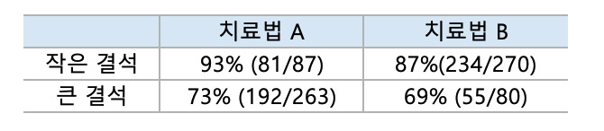 위 테이블을 보고 어떤 약물이 더 효과적인가라고 묻는다면, 다들 '치료법 B가 더 효과적이다'라고 답할텐데요. 하지만 이 테이블에 부분 그룹에 대한 변수(신장 결석의 크기)를 추가하여 좀 더 자세히 살펴보면 얘기가 달라질 수 있습니다.