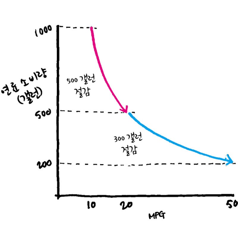 실제로 계산을 해보면 1만 km를 달렸을 때 A는 500ℓ를 아끼게 되지만, B는 300ℓ를 아끼는 데 그치는 것을 알게 되는데요. 결과를 보고 다소 의아해 할 수도 있을 것 같은데 이는 우리의 두뇌는 일반적으로 선형적(linear)인 사고를 하기 때문입니다.