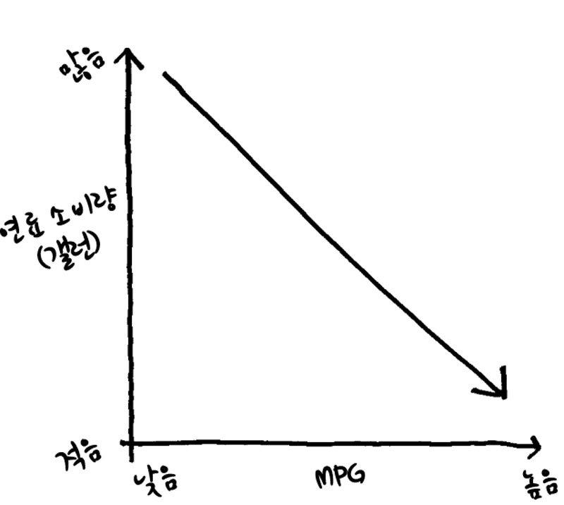 처음 상황을 봤을 때 우리는 위의 그림처럼 생각을 하게 되는 것이죠. 하지만 이 그래프는 정확하지 않습니다. 연료 소비량과 연비는 선형적인 함수관계가 아니기 때문이죠. 실제로 계산해 보면 그래프는 아래와 같은 모습을 확인할 수 있습니다.