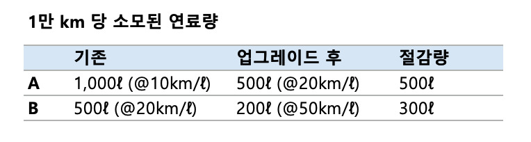 위의 문장만 놓고 직관적으로 생각해본다면 B가 더 좋은 결정이라는 생각이 들거 같은데요. 연비의 상승폭으로 볼 때 30km/ℓ의 증가가 10km/ℓ증가 보다 훨씬 크기 때문이죠. 백분율로 생각해도 100% 향상인 A의 결과보다, 150% 향상되는 B의 결과가 더 좋아보입니다.