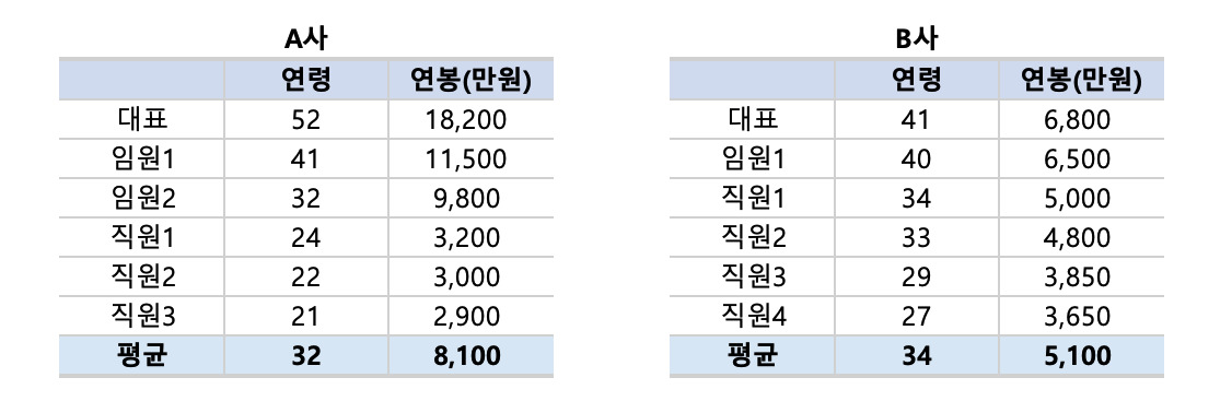 아마 A사가 더 젋고, 연봉도 높아보이니 훨씬 좋은 회사라고 생각하게 될 거 같은데요. 이렇게 생각하는 게 정말 올바른 해석일까요?