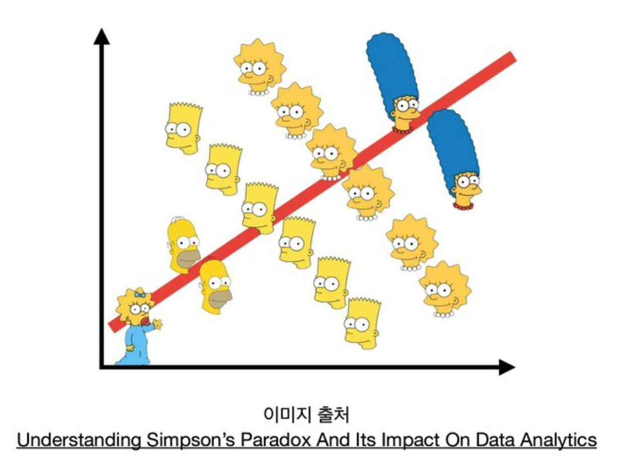 결과적으로 세부 변수를 확인하지 않고 데이터를 통합해서 확인하게 되면 원래 결과와는 전혀 다른 의미를 도출하는 오류를 범하게 되는 것을 확인할 수 있죠.