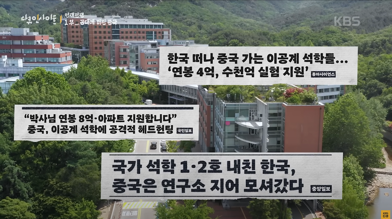 이런 모습은 우리 지난 정부의 R&D 예산 삭감과 정반대의 모습이다. 다큐에서 실제로 한국에서 정년퇴임을 한 물리학과 교수가 중국의 푸단 대학교 석좌교수로 인터뷰하는 모습이 나온다. 그는 처음에는 중국으로 가는 일이 한국에 누가 되지 않을까? 생각했지만, 과학자와 과학계를 푸대접하는 자국의 모습에 미래가 없다고 본 것 같다. 한국보다 더 높은 연봉과 대학교 인근 특급호텔에 숙소를 마련해 준 중국 측의 지원을 받으며 오길 잘했다는 이야기를 하는 모습이 그분 개인에게는 좋은 일이었지만 대한민국 국민으로서 조금 안타까웠다.