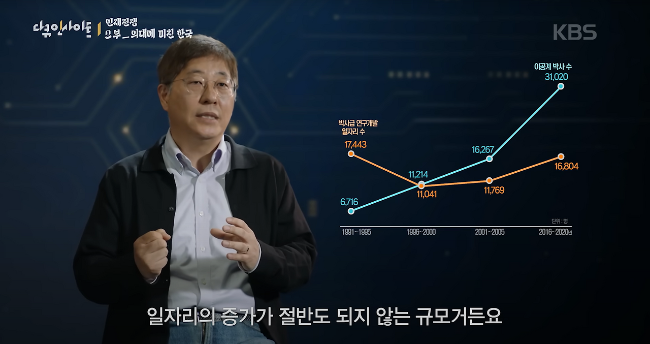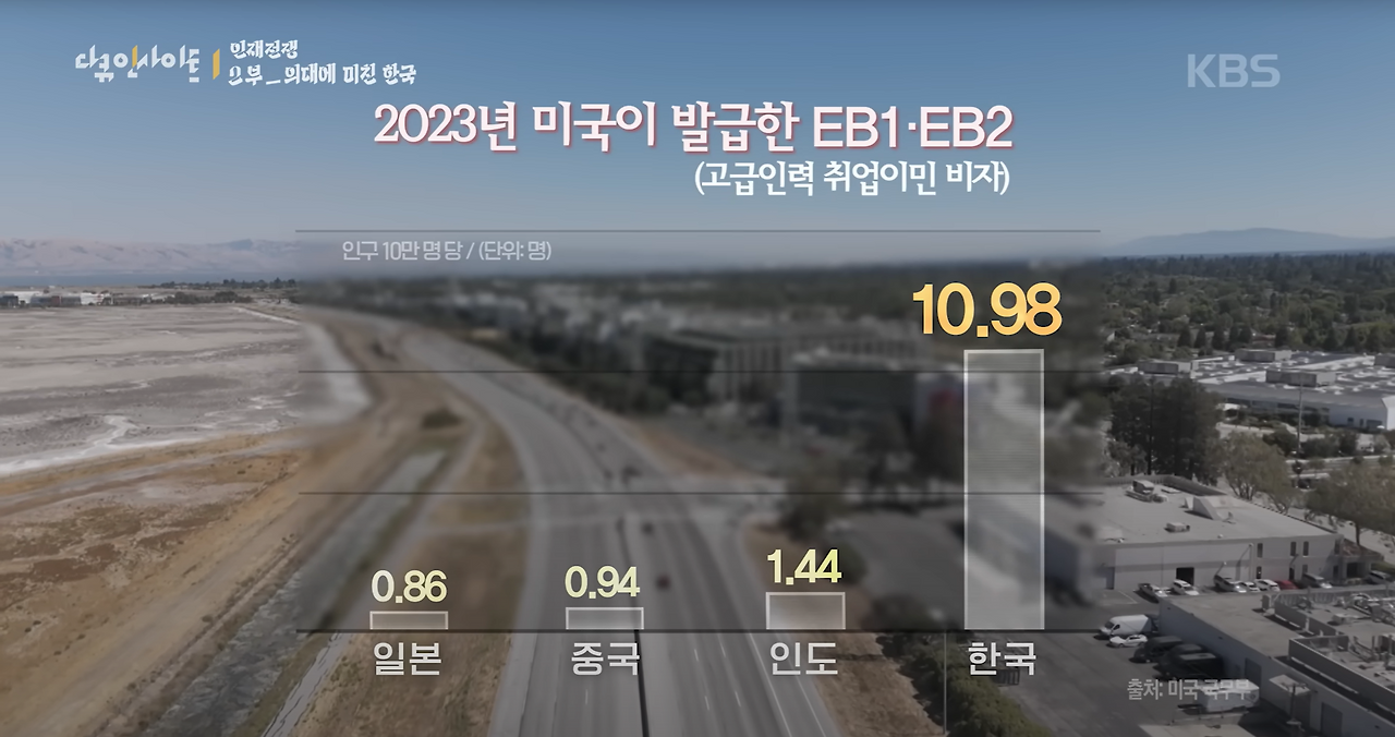 과학분야는 비용과 연구인력, 시간이 많이 들어가는데, 이런 한국의 현실에서는 인재들이 해외로 유출될 수 밖에 없다. 실제로 미국 국무부 자료에 따르면 2023년 미국의 고급인력 취업이민 비자(EB1, EB2)의 발급비율이 가장 높은 나라가 한국이다. 또한, 한국의 이공계 박사수는 계속 증가하는 반면 박사급 연구개발 일자리는 일자리 증가의 절반 수준도 되지 않는 점이 더욱 충격적인 것 같다.